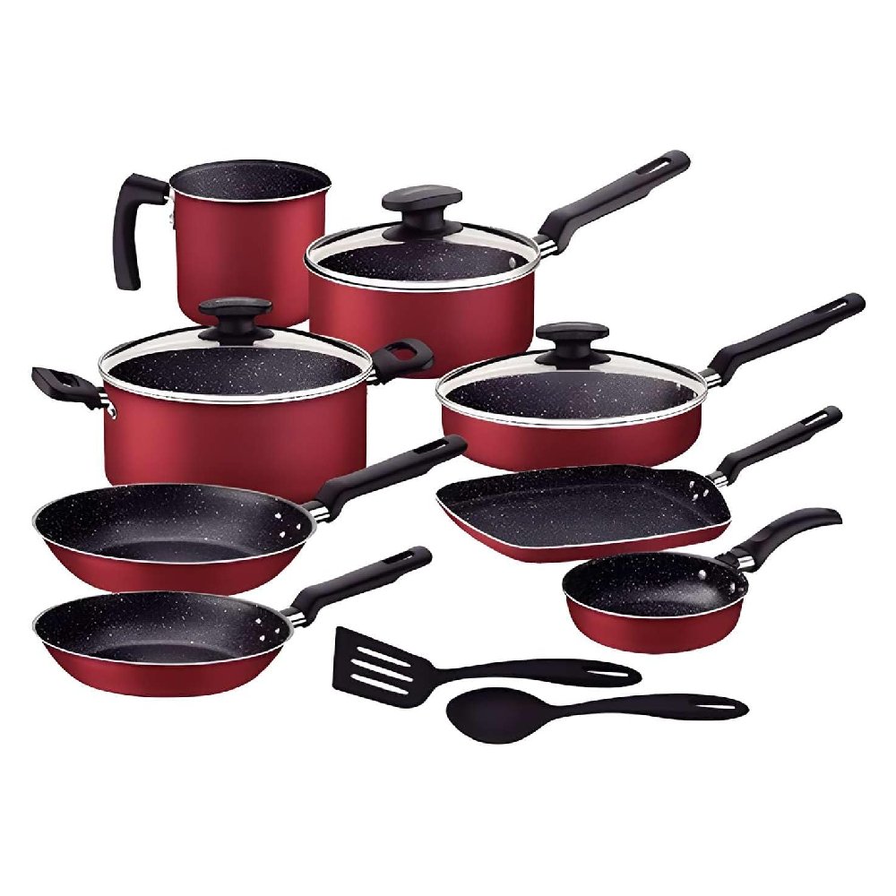 - Piezas incluidas: 5 sartenes, 1 olla con tapa, 1 cazo con tapa, 1 hervidor, utensilios básicos (espátula y cuchara)