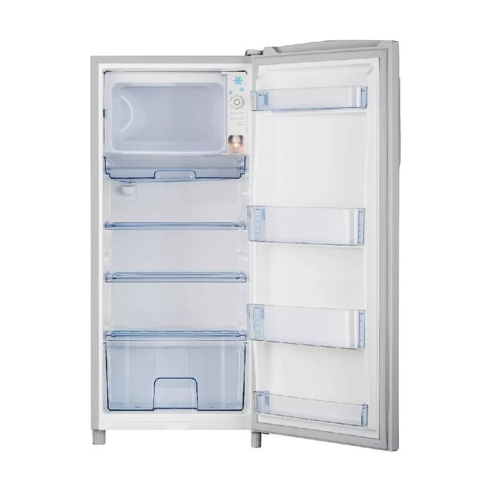 Está diseñado para espacios pequeños con sus medidas de 59.1 x 53.6 x 128 cm, además tiene 7 pies de capacidad. Cuenta con despachador de agua, congelador semiautomático y ahorrador de energía. Guarda tus vegetales en su gran cajón, además incluye dos parrillas ajustables y huevera.